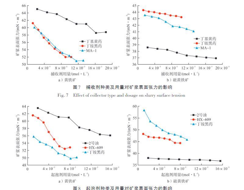 為研究捕收劑種類及用量對礦漿表面張力的影響,將黃鐵礦與磁黃鐵礦配成30%濃度的礦漿,起泡劑2號油用量3×10-5 mol/L、粒度-0.074 mm占比80%、pH=7,改變捕收劑種類及用量以測定礦漿表面張力,結果見如圖7。