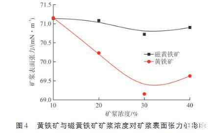圖4黃鐵礦與磁黃鐵礦礦漿濃度對礦漿表面張力的影響