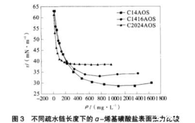 圖3不同疏水鏈長度下的ɑ-烯基磺酸鹽表面張力比較