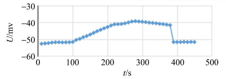 金屬吊環這一運動過程中電壓值也趨于平穩,對應于圖2中380~450 s這一時間段的變化曲線.