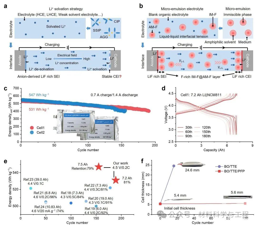 圖1(a)、(b)Li+在充電過程的傳輸行為及正負(fù)極界面演化示意圖,對應(yīng)Li+溶劑化策略(a)和微乳電解液策略(b);(c)Li||NCM811軟包電池在微乳電解液中的循環(huán)性能;(d)電池的電壓-容量曲線;(e)本文與報道的電池性能對比;(f)電池在循環(huán)前后的厚度變化
