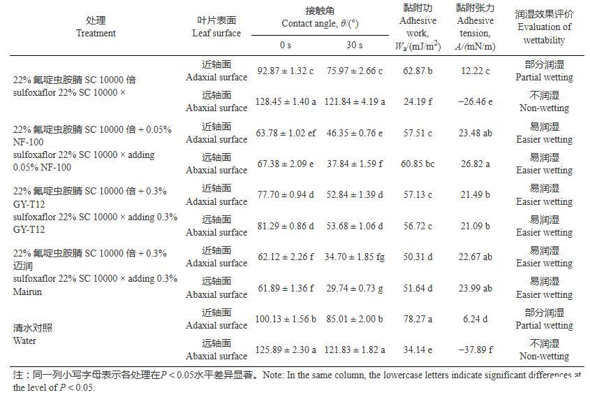 表2數據顯示,水滴在蘋果葉片近軸面和遠軸面上30 s時的穩定接觸角分別為85.01°和121.83°,由此判斷蘋果葉片的近軸面為親水表面,遠軸面為疏水表面。未添加助劑時,22%氟啶蟲胺腈SC液滴在近軸面0~30s的接觸角動態變化為92.87°~75.97°,在遠軸面0~30 s的接觸角始終大于120°,說明22%氟啶蟲胺腈SC藥液對蘋果葉片近軸面可部分潤濕,對遠軸面無法潤濕。添加3種助劑后,藥液液滴在近軸面及遠軸面的接觸角均顯著降低至90°以下(P<0.05),此時可以同時潤濕兩種表面;其中在親水性近軸面0 s和30 s的接觸角分別降低15.2°~30.8°和23.2°~41.3°,在疏水性遠軸面分別降低47.2°~65.7°和68.0°~93.5°,說明添加助劑顯著降低了藥液的接觸角,且在遠軸面接觸角的降低幅度更大。