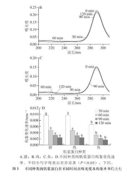 圖1不同種類(lèi)肉肌漿蛋白在不同時(shí)間點(diǎn)吸光度及構(gòu)象速率的變化