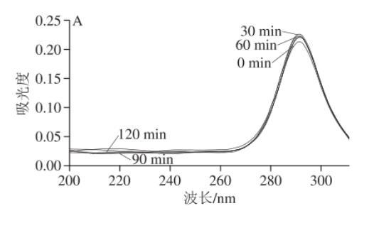 鹽酸胍誘導(dǎo)肌漿蛋白變性的熒光光譜如圖1A~C所示,3種肌漿蛋白都在290 nm波長(zhǎng)處達(dá)到最大吸光度,由于酪氨酸主要對(duì)250~290 nm波長(zhǎng)范圍內(nèi)具有吸收。由肌漿蛋白氨基酸組成可知,雞肉肌漿蛋白的酪氨酸含量最高,這也解釋了在第0分鐘時(shí)雞肉肌漿蛋白的吸光度相比較而言達(dá)到最大。而且豬肉和魚(yú)肉肌漿蛋白在第120分鐘時(shí)達(dá)到最大吸光度,這說(shuō)明肌漿蛋白三級(jí)結(jié)構(gòu)改變時(shí),構(gòu)象發(fā)生重排且構(gòu)象展開(kāi),而雞肉肌漿蛋白在第120分鐘時(shí)吸光度有所下降,說(shuō)明雞肉肌漿蛋白結(jié)構(gòu)改變較快。由圖1D可知,隨著時(shí)間的延長(zhǎng),構(gòu)象變化速率越來(lái)越小,并且在相同時(shí)間下,豬肉肌漿蛋白與雞肉肌漿蛋白的峰值變化速率無(wú)顯著差異(P>0.05),而魚(yú)肉肌漿蛋白峰值變化速率相比較而言顯著較慢(P<0.05)。這一結(jié)果表明,和魚(yú)肉肌漿蛋白相比,豬肉和雞肉的肌漿蛋白構(gòu)象柔順性更好。