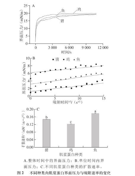 肌漿蛋白的吸附動(dòng)力學(xué)實(shí)驗(yàn)表明魚(yú)肉肌漿蛋白的擴(kuò)散速率較豬肉和雞肉肌漿蛋白間顯著較大,這可能是由于大粒徑的肌漿蛋白產(chǎn)生的空間位阻在一定程度上削弱了表面疏水性的提高帶來(lái)的吸附速率的增加,但雞肉與豬肉肌漿蛋白之間的擴(kuò)散速率卻無(wú)顯著性差異。