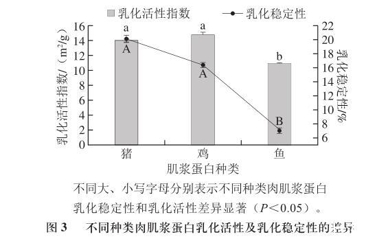 圖3不同種類(lèi)肉肌漿蛋白乳化活性及乳化穩(wěn)定性的差異
