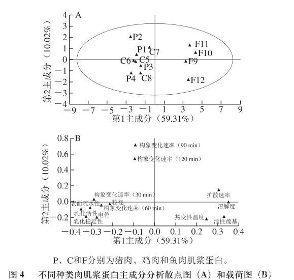 圖4不同種類(lèi)肉肌漿蛋白主成分分析散點(diǎn)圖(A)和載荷圖(B)