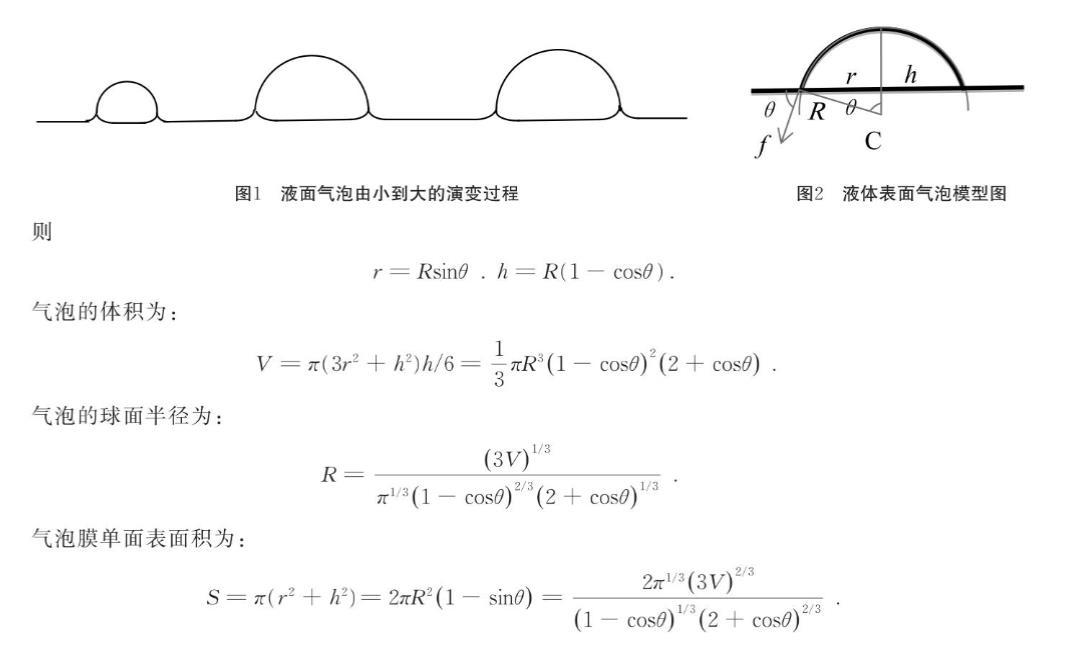 氣泡一般是由于氣體通過小孔浸人液體層后分散擴張形成的.在氣泡形成過程中,由于液體表面張力的作用,使液膜呈收縮趨勢.球形氣泡的液膜表面積最小,所以,在沒有其他因素影響的條件下,空中和液體中的氣泡應處于球形的亞穩(wěn)狀態(tài).當氣泡落在液體表面或由液體內(nèi)部上升到液體表面以后,沒破裂的氣泡不再呈現(xiàn).球形狀態(tài),與液體表面直接形成的氣泡一樣,呈現(xiàn)球缺形狀.液面氣泡由小到大的演變過程如圖1所示.當氣泡足夠大時,液體表面氣泡實際形狀接近半球,但在氣泡與液體表面接觸處可觀察到氣泡內(nèi)、外均存在液面向上彎曲現(xiàn)象,且泡內(nèi)水平液面相比氣泡外水平液面位置出現(xiàn)微小凹陷.