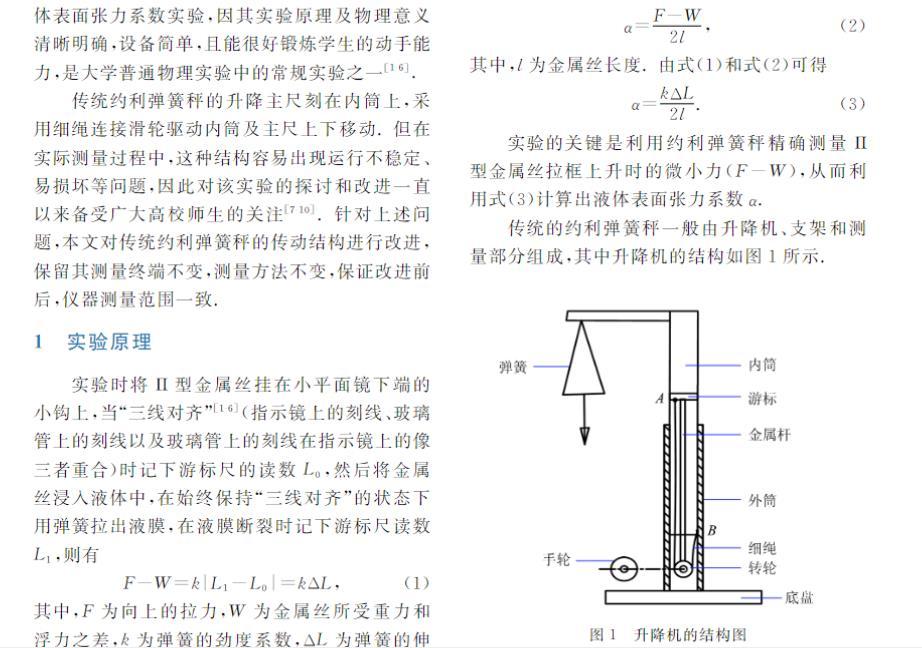 約利彈簧秤是一種精細彈簧秤,常用來測定微小的力。利用約利彈簧秤采用拉脫法測量液體表面張力系數(shù)實驗,因其實驗原理及物理意義清晰明確,設備簡單,且能很好鍛煉學生的動手能力,是大學普通物理實驗中的常規(guī)實驗之一。