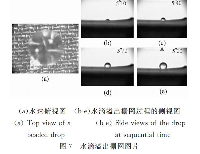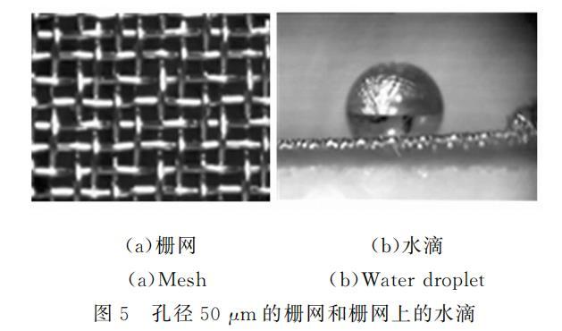 所用柵網為不銹鋼濾網,有一定剛度,管道較窄,可以保證管道頂面平整。柵網孔為方形,使用的兩種柵網孔邊長分別為50mu m和77mu m。部分柵網涂覆Teflon(AF2400,DuPont),部分沒有做處理。圖5所示為未經處理的柵網和柵網上的水滴。