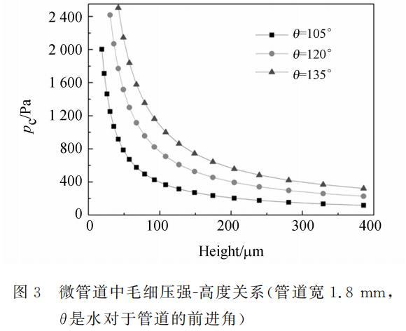 其中,l_i是液體與管道第i條邊接觸線的長度,theta_i是液體對于管道第i條邊的前進角,對于矩形管道有i=1,2,3,4。毛細壓強和管道高度的關系如圖3所示。液體在疏水網表面的流動阻力計算比較復雜,現在有很多的研究文獻,由于這不是本文的研究重點,文中采用了簡化分析,即把柵網作為一個光滑的表面。計算中認為柵網與管道的表面特性相同。