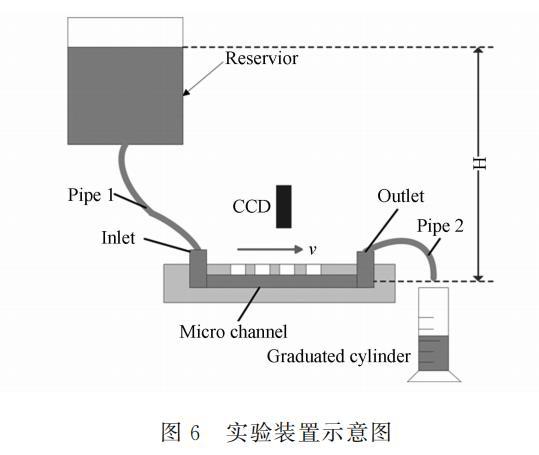 實驗裝置如圖6所示。由于人口、出口和管子尺寸都遠大于微管道尺寸,測得的水頭高度H視為加在微管道人口的總水頭。