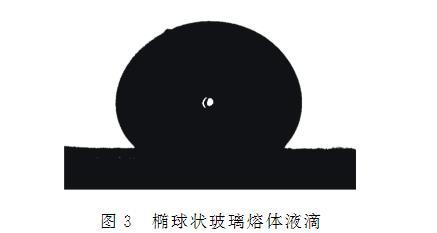 將制備的玻璃樣塊用錫紙包裹,用鐵錘捶碎后用鉗子修整成較方正的顆粒,選取內(nèi)部無氣泡結(jié)石且質(zhì)量為0.15~0.30g的碎塊用于測(cè)試。測(cè)試前選用T4溫度表面張力為334 mN/m的標(biāo)準(zhǔn)鈉鈣玻璃校準(zhǔn)表面張力測(cè)量?jī)x。測(cè)試的具體操作步驟如下:將表面張力測(cè)量?jī)x加熱爐升溫至測(cè)量溫度,通入高純氮?dú)庾鳛楸Wo(hù)氣體,然后將制備好的玻璃樣品置于石墨片上,送入加熱爐中的樣品臺(tái)上進(jìn)行保溫,試樣在表面張力作用下收縮成橢球狀液滴,如圖3所示,將液滴置于拍攝裝置視野中心,保溫30 min至熔體穩(wěn)定。隨后,用圖像采集裝置獲取橢球熔體的外輪廓線,通過軟件數(shù)值分析得到輪廓參數(shù),利用Young-Laplace方程進(jìn)行解析,計(jì)算出樣品的表面張力(σ),反復(fù)測(cè)試若干次后取σ的平均值為樣品在該測(cè)試條件下的表面張力值。