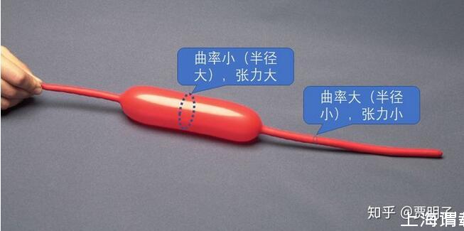 氣球內(nèi)部的氣體壓力處處相等,但是,接觸過這種氣球的人都有一個經(jīng)驗(yàn),就是粗的地方繃得緊,而細(xì)的地方繃得就不那么緊。如上圖所示,繃得緊的地方和繃得松的地方,產(chǎn)生的壓力差是相等的,但是他們的曲率是不相等的:曲率越大,同樣的張力所能產(chǎn)生的壓力差就更大。