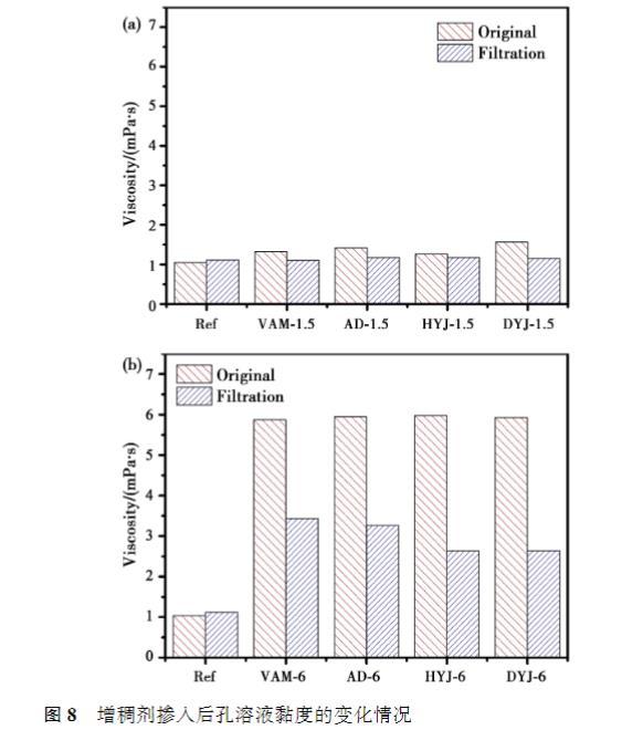 相同摻量下,DYJ的黏度最高,其次是HYJ,VAM和AD黏度在低摻量下接近,摻量達到0.10%之后,VAM黏度高于AD;VAM和AD的黏度隨著摻量的提高緩慢增大,而HYJ和DYJ溶液的黏度隨摻量的提高迅速提高,尤其是DYJ的增長幅度更為顯著??傮w來看,增稠劑分子量越大,相同摻量時溶液的黏度越高。從表面張力的結果來看,相同摻量下,HYJ溶液的表面張力最高,其次是DYJ,VAM和AD的表面張力顯著低于其他兩種增稠劑,且AD略微高于VAM.