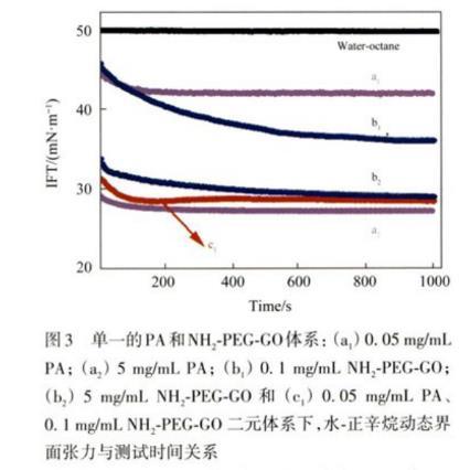 當低質量濃度的NH2-PEG-GO與PA共存時,相比于單組分NH2-PEG-GO(0.1 mg/mL)或PA(0.05 mg/mL)能更有效降低界面張力。例如,油相水相分別添加低質量濃度的PA(0.05 mg/mL)與NH2-PEG-GO(0.1 mg/mL),即可實現與單獨添加高質量濃度PA(5 mg/mL)或NH2-PEG-GO(5 mg/mL)相同的效果。并且此時界面張力隨時間變化曲線與單獨添加PA類似,平衡時間在200 s左右。這表明前期的界面張力降低現象主要由PA吸附引起。