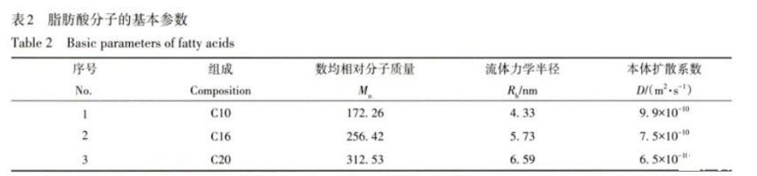 對比不同鏈長脂肪酸在不同質(zhì)量濃度時的動態(tài)界面張力(圖9A-9C),發(fā)現(xiàn)雖然脂肪酸在正辛烷中的擴散系數(shù)隨著碳鏈的增長而減小(表2),但添加高質(zhì)量濃度C20酸時,界面張力值到達平衡的時間明顯縮短,這表明脂肪酸烷基鏈長度會影響脂肪酸在界面的性質(zhì)。并且發(fā)現(xiàn)脂肪酸烷基鏈越長,與NH2-PEG-GO協(xié)同穩(wěn)定的水-正辛烷界面張力越低。并且隨著脂肪酸質(zhì)量濃度增加,烷基鏈鏈長增加對界面張力降低效果越明顯(圖9D)。