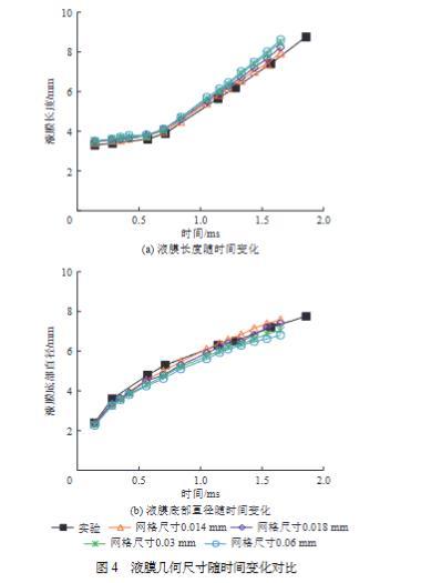 為了進行網(wǎng)格尺寸獨立性分析,在計算域尺寸為21 mm×66 mm時,將網(wǎng)格尺寸分別設(shè)置為0.06、0.03、0.018和0.014 mm。在實驗中的碰撞條件為顆粒直徑dp=3 mm,液滴直徑dd=3.93 mm,接觸角θ=168.4°,撞擊速度v0=4.17 m/s。在上述相同碰撞條件下,利用不同網(wǎng)格尺寸開展數(shù)值模擬,并測量不同時刻下液膜長度和液膜底部直徑的變化數(shù)據(jù)進行對比,如圖3所示。如圖4所示,隨著網(wǎng)格尺寸降低,數(shù)值模擬結(jié)果與實驗結(jié)果趨于重合。當21 mm×66 mm計算域的網(wǎng)格尺寸達到0.014 mm時,數(shù)值模擬結(jié)果與實驗結(jié)果之間的偏差低于5%,圖5a對比了網(wǎng)格尺寸為0.014 mm時模擬得出的液滴形態(tài)與實驗中拍攝的液滴形態(tài),兩者具有較高的吻合度。故后續(xù)模擬中均按此比例生成計算域網(wǎng)格。