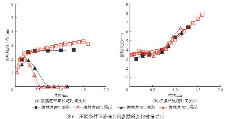 為進一步驗證本模型計算結(jié)果的可靠性,依據(jù)BANITABAEI等在實驗中設(shè)置的不同碰撞條件,開展了相應(yīng)的數(shù)值模擬。如圖5b和圖5c所示,在不同碰撞條件下,數(shù)值模擬結(jié)果中的液滴形變過程與實驗結(jié)果均具有較高的吻合度。圖6對比了數(shù)值模擬結(jié)果與實驗結(jié)果中液滴幾何尺寸的變化過程,也具有較高的吻合度。其中,圖6a所展示的液膜底部直徑隨時間變化曲線,數(shù)值模擬結(jié)果與實驗結(jié)果稍有偏差,原因是實驗中固定顆粒的支撐柱對液膜底部的形變過程產(chǎn)生了一定影響。綜上所述,可認為筆者構(gòu)建的數(shù)值模擬模型合理,結(jié)果具有較高可靠性。由于在毫米尺度下和微米尺度下,液滴與固體顆粒的碰撞過程均遵守經(jīng)典牛頓力學定律和經(jīng)典流體力學理論,所以本數(shù)值模擬模型可用于微米尺度下的其他工況條件的數(shù)值模擬研究。
