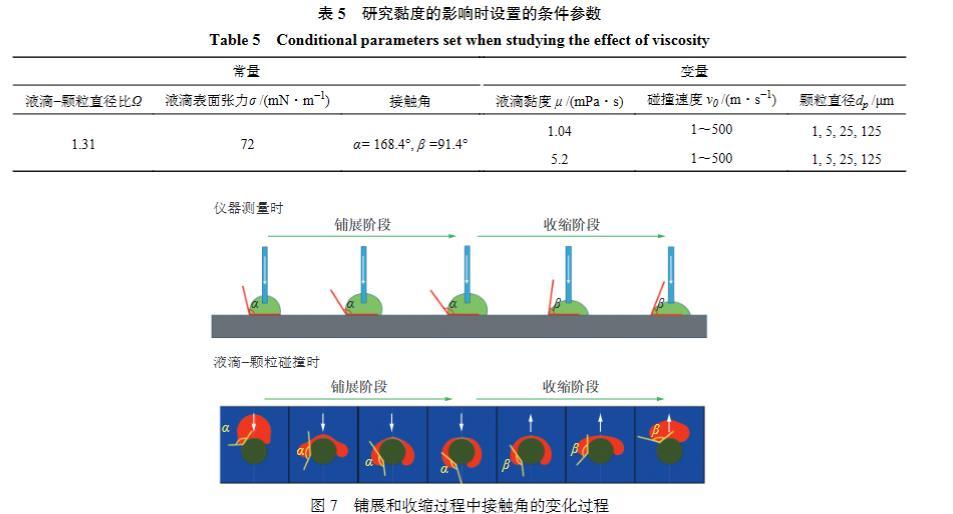 由于碰撞速度、粒徑和液滴黏度均會對液滴與顆粒的碰撞行為產(chǎn)生明顯影響,筆者針對這幾個因素設(shè)置了不同的數(shù)值模擬工況。具體工況參數(shù)見表5所示,其中液滴鋪展過程中的前進接觸角為α;液滴收縮過程中的后退接觸角為β。利用數(shù)值模擬軟件的自動保存功能,對碰撞行為發(fā)展過程中不同時刻的模擬數(shù)據(jù)進行了保存。如圖7所示,當液滴在顆粒表面鋪展時,在迭代過程中將接觸角值設(shè)置為α。在液滴在顆粒表面的鋪展過程轉(zhuǎn)變?yōu)槭湛s過程的時刻,將接觸角數(shù)值由α改為β,再進行后續(xù)的迭代計算。