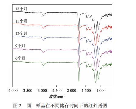 為了探究表面轉(zhuǎn)移涂層是否發(fā)生了結(jié)構(gòu)變化,對不同儲(chǔ)存時(shí)間下的樣品進(jìn)行紅外光譜測試分析,見圖2。可以看出,儲(chǔ)存時(shí)間為6—18個(gè)月的樣品的紅外譜圖并未發(fā)生明顯變化。譜圖的一致性證明了噴鋁紙表面轉(zhuǎn)移涂層的基本結(jié)構(gòu)并未隨著時(shí)間發(fā)生明顯變化,即掉墨現(xiàn)象的出現(xiàn)并非由于轉(zhuǎn)移涂層出現(xiàn)結(jié)構(gòu)變化導(dǎo)致。根據(jù)相關(guān)研究,噴鋁紙?jiān)趦?chǔ)存的時(shí)候,紙張及涂層中添加的助劑,環(huán)境介質(zhì)中的水分子、油污和空氣等小分子物質(zhì)會(huì)通過吸附、擴(kuò)散、遷移和凝集等作用,甚至鍵合等途徑,在轉(zhuǎn)移涂層表面形成低分子物質(zhì)的富集區(qū),即弱界面層,降低了轉(zhuǎn)移涂層的表面張力,并使其印刷適性變差。