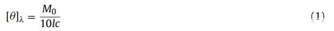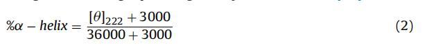 其中 θλ 是在波長處觀察到的橢圓度(以毫度為單位) λ,M0 是蛋白質(zhì)的平均殘基重量,c 是蛋白質(zhì) 以克/立方厘米為單位的濃度,l 是細(xì)胞的光程長度,以厘米為單位。 222 nm 處的橢圓度值 (θ222nm/mdeg)用于計算BSA的α-螺旋含量 使用 Morrisett 等人給出的以下等式。 [44]