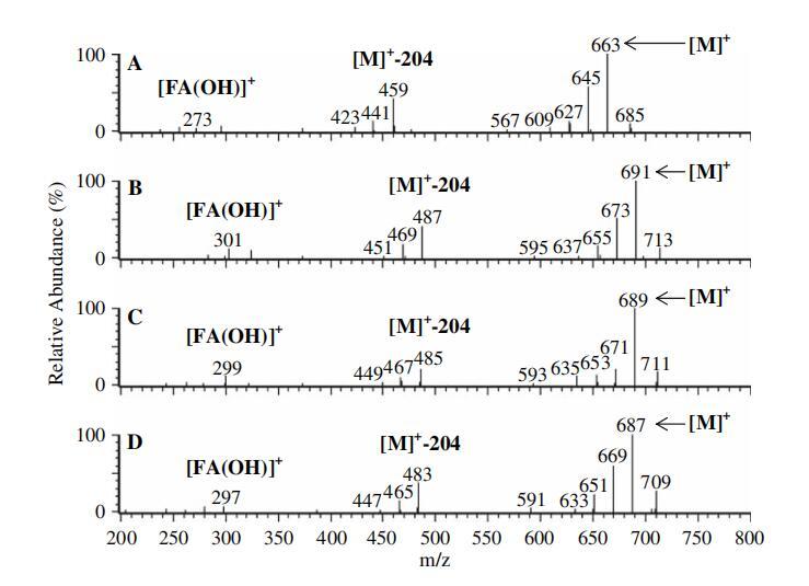 圖3正大氣壓化學電離(APCI)-來自圖2中每個TIC色譜圖基峰的質譜圖。 圖2的TIC中的C16:0二乙酰化槐脂內酯(RT=16.7分鐘)、圖2的TIC中的C18:0二乙酰化槐脂內酯(RT=25.2分鐘)、圖2c的TIC中的C18:1二乙酰化槐脂內酯(RT=20.7分鐘)和圖2d的TIC中的C18:2二乙酰化槐脂內酯(RT=15.8)。 ([M]+=質子化分子離子;[M]+-204=質子化分子離子-減去乙酰化己糖(質量204);[FA(OH)]+=質子化羥基脂肪酸)