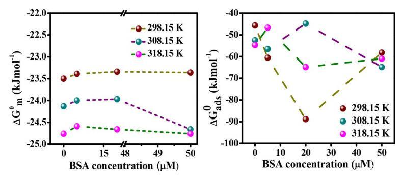 圖3. 在不同溫度下,DG0 m和DG0 ads隨BSA濃度的變化。