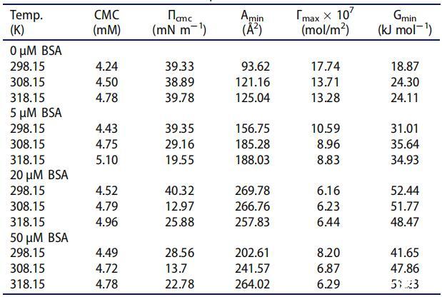 表1.[C10-4-C10im]Br2在不同溫度下存在不同濃度BSA時的界面參數。