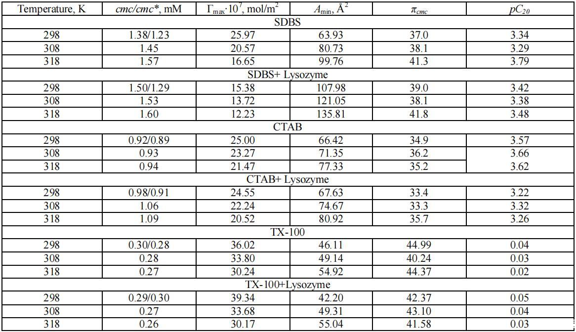 Γmax和Amin的值如表1所示。Γ最大值隨著溫度的升高而減小,其中隨著Amin值的增加。因此,如果三種表面活性劑均為純表面活性劑,并且存在溶菌酶,則這兩個因素相互補充,這表明這些系統同時涉及靜電和疏水作用[28]。在離子表面活性劑的情況下,與CTAB相比,SDBS的Γmax值下降更多,這表明SDBS和溶菌酶之間形成的復合物比CTAB和溶菌酶更有利。同時,阿明的增加與Γmax相反。