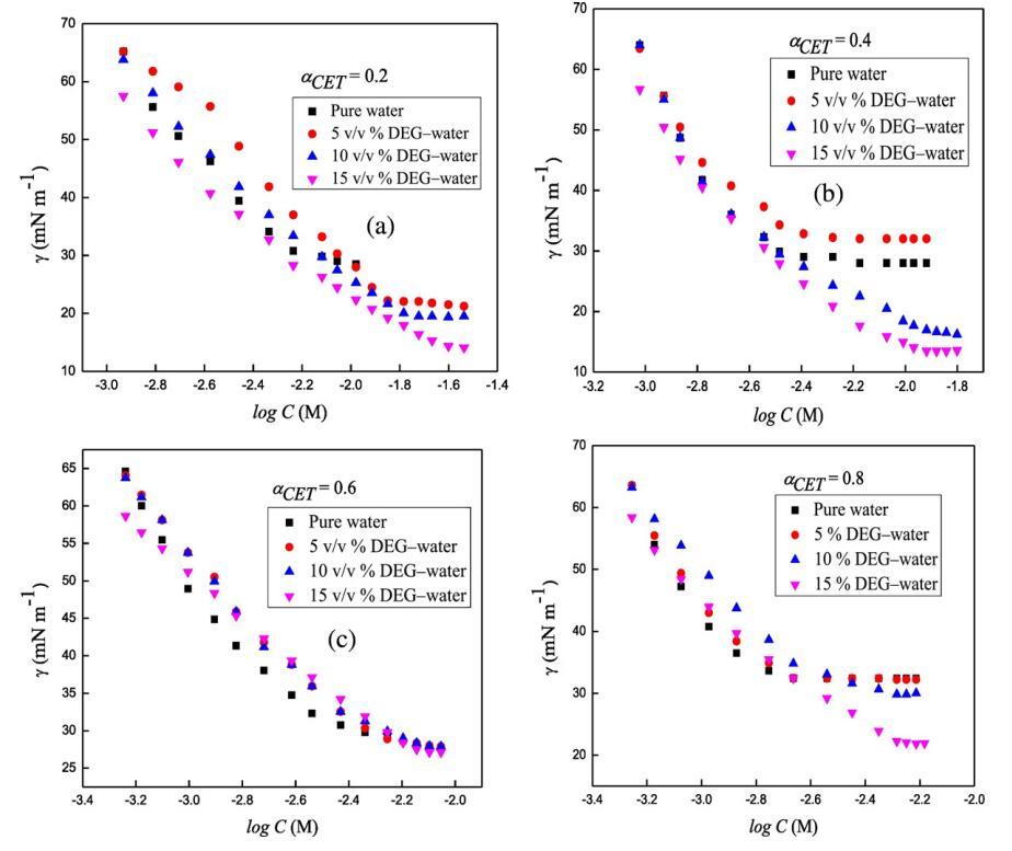 使用表面張力測量法測定了CET、[C10min][Cl]和混合體系CET+[C10min][Cl]在水和DEG-水混合溶劑中的表面活性(圖2)。表面張力值隨表面活性劑濃度的增加而減小,在某一特定區域,表面活性劑分子在氣液界面上的吸附接近于一個常數。表面張力測量對于計算這些表面活性劑及其混合體系的各種參數非常有用。