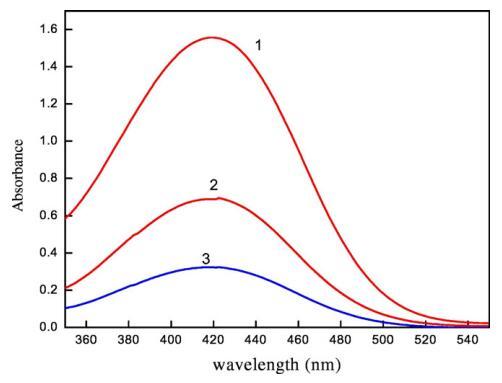 圖5.[CET]對水性甲酚紅染料可見光譜的影響:(1)[CET]=0mm,(2)[CET]=0.50mm,(3)[CET]=20mm。[CR]=3×10?5毫米。