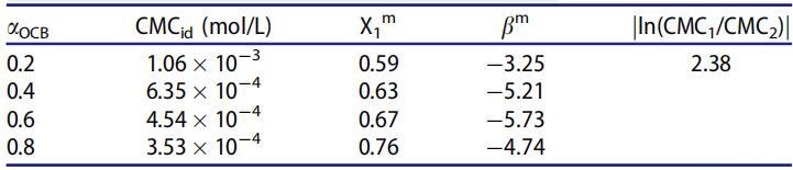 表3。25℃水溶液中OCB/SDS體系不同摩爾分數(αOCB)的非理想性及相互作用參數。