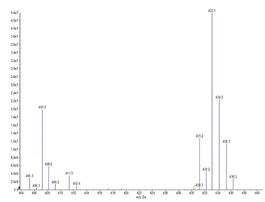 OCB:IR:3363 cm-1(N-H)、1596 cm-1(C=O)、1250 cm-1(C-O)、1421 cm-1(酰胺鍵中的C-N)和1069 cm-1(季銨基中的C-N)。ESIMS:m/z=411.3,409.2分別歸因于由油酸甘油酯(C18:1)和亞油酸甘油酯(C18:2)與H+衍生的羧基甜菜堿;m/z=407.2、405.3、435.3、433.1、431.2,分別與來自棕櫚酸甘油酯(C16)、棕櫚油酸甘油酯(C16:1)、硬脂酸甘油酯(C18)、油酸甘油酯(C18:1)和亞油酸甘油酯(C18:2)的含Na+的羧基甜菜堿相匹配。