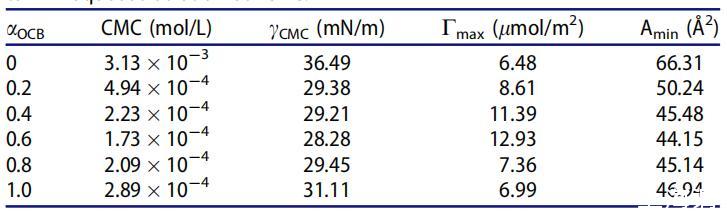 表2。OCB/SDS體系在25℃水溶液中不同摩爾分數(αOCB)的表面性質。