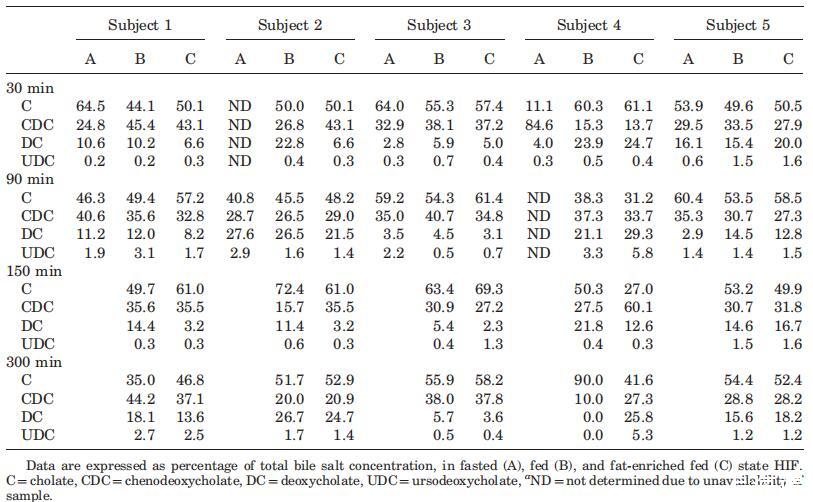表3。餐后不同時(shí)間的個(gè)體相對膽汁鹽池成分(%)a