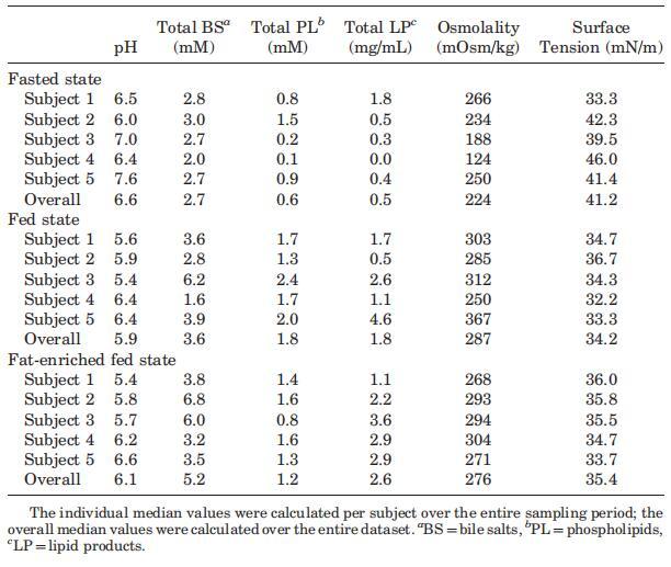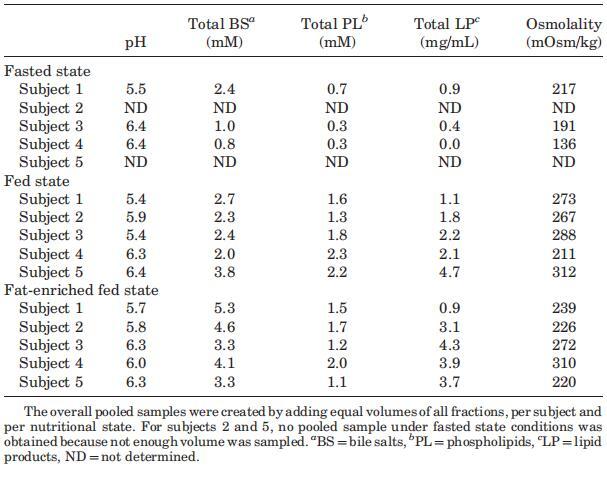 攝入Sure Plus1或Scandishake Mix1后前2小時(shí)的滲透壓通常高于禁食狀態(tài)下的HIF,盡管禁食狀態(tài)和兩種喂食狀態(tài)之間未達(dá)到顯著差異。禁食狀態(tài)滲透壓值一般為低滲透,或接近等滲透值。224 mOsm/kg的總體中值為低滲透性,與Brouwers等人1和Deferme等人報(bào)告的人類十二指腸吸出物的平均滲透壓一致。,38但高于Perez de la Cruz Moreno等人報(bào)告的平均值。24在給藥(n?3)后,在混合樣品中獲得的滲透壓較低,與Kalantzi等人11和Gisolfi等人報(bào)告的滲透壓較好。39在喂食和富含脂肪的喂食狀態(tài)下均發(fā)現(xiàn)高滲值,尤其是在消化的前3小時(shí)。在喂食和富含脂肪的喂食狀態(tài)下,總的中位數(shù)滲透壓為等滲透壓(分別為285和278 mOsm/kg)。進(jìn)食后180分鐘內(nèi)較高的滲透壓與膽汁鹽濃度、磷脂或脂質(zhì)產(chǎn)物總量無關(guān)。Kalantzi等人19將吸入十二指腸內(nèi)容物的高滲值歸因于雙糖和果糖復(fù)合碳水化合物的存在,以及后者的緩慢吸收。在本研究中未確定總碳水化合物水平,因此,該陳述無法驗(yàn)證。