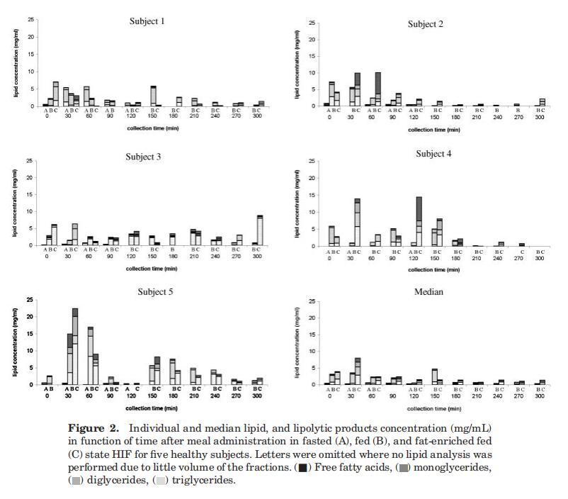 因此,根據(jù)這些數(shù)據(jù),TG和DG、MG或FFA之間沒有相關(guān)性。受試者的總脂質(zhì)濃度差異很大。與受試者4和5相比,受試者1、2和3在喂食條件下的十二指腸總脂濃度通常較低。Hernell等人也描述了從Treitz角度取樣的十二指腸脂質(zhì)含量的顯著受試者間差異。27除了明顯的受試者間差異外,個(gè)體濃度也隨時(shí)間波動(dòng)。受試者體內(nèi)的這種變異可能由多種因素解釋,包括胃排空的變化、胃腸道的擴(kuò)散、同時(shí)進(jìn)行的消化和吸收以及腸道內(nèi)容物的不均勻分布。利用磁共振成像(MRI),Weitschies及其同事最近證實(shí)了腸道內(nèi)液體的不均勻分布;28腸液被稱為在水囊中分離;此外,研究還表明,進(jìn)食后小腸液體總量顯著減少。胰脂肪酶在油水界面發(fā)揮作用;因此,脂肪分解消化產(chǎn)物預(yù)計(jì)將在這些水袋的直接環(huán)境中釋放。由于水分室不連續(xù)分布,脂肪分解產(chǎn)物在小腸中也不均勻分布。這可以解釋剖面中觀察到的可變性。然而,在五名受試者中,隨著時(shí)間的推移計(jì)算出的總脂質(zhì)濃度中值顯示,在給藥30分鐘后濃度降低,在給藥120分鐘后達(dá)到穩(wěn)定狀態(tài)(圖2)。由于個(gè)別pro文件有時(shí)與此中間配置文件存在很大差異,因此平均配置文件的有用性可能會(huì)受到質(zhì)疑。29,30然而,這一中位數(shù)曲線確實(shí)與先前的研究一致,在之前的研究中,攝入食物后約1小時(shí),脂質(zhì)濃度處于穩(wěn)定狀態(tài),持續(xù)3小時(shí)。11,12,31穩(wěn)態(tài)期間描述了恒定的TG濃度,而FFA濃度增加或恒定。在之前的每一項(xiàng)研究中,F(xiàn)FA水平在每個(gè)測量點(diǎn)都高于鎂水平;計(jì)算得出該比率約為3-6。相反,目前的數(shù)據(jù)集指出,在整個(gè)收集期內(nèi),鎂是主要成分,其次是FFA。TG的含量通常非常少或無法檢測到。這可能意味著膳食TG的快速水解,從胃脂肪酶開始。其他人也提出了類似的意見。11,31當(dāng)將這些數(shù)據(jù)與以前提出的腸道脂質(zhì)濃度進(jìn)行比較時(shí),應(yīng)注意到以前的濃度始終以摩爾水平表示,而在本研究中,結(jié)果以w/v濃度單位表示。因此,MG/FFA的比率在以重量為基礎(chǔ)表示時(shí)將以犧牲游離脂肪酸為代價(jià)進(jìn)行移動(dòng),當(dāng)然對于由長鏈脂肪酸組成的脂質(zhì)材料而言。