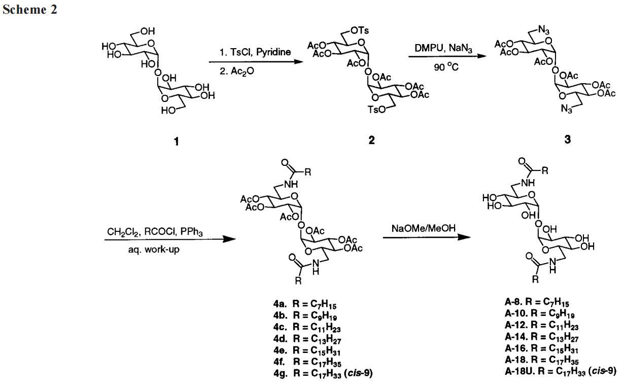 2,3,4,2′,3′,4′-六鄰乙酰基-6,6′-二十八胺基-6,6′-二脫氧-r,r-D-海藻糖,4a。按照上述一般程序,2.1 g(3.3 mmol,6.5 mmol當(dāng)量)3,50 mL CH2Cl2和2.7 mL(9.8 mmol)辛酰氯,以及2.4 g(9.2 mmol)PPh3與15 mL CH2-Cl2反應(yīng)。黑色固體被過濾,留下栗色溶液。洗滌和干燥后,對所得棕色糖漿進行色譜分析,得到2.2 g(80%)4a,白色固體,mp 70-72°C。