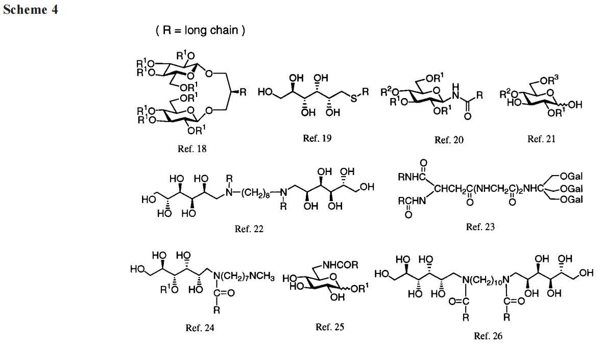 我們的第一個驚喜是發(fā)現(xiàn)A系列海藻糖雙子座不溶于水。例如,A-12、A-14和A-16(指鏈長的數(shù)字)在1毫升溫水中旋轉(zhuǎn)2毫克時會留下沉淀物。即使在70°C的溫度下,A-10也會在這種處理過程中形成渾濁的懸浮液。A-8在室溫下的可溶濃度僅為1-2 mM(根據(jù)動態(tài)光散射,在該濃度下,會形成膠束大小的聚集體)。天真地說,人們可能會認(rèn)為a-8的溶解度大得多,因為該分子由六個羥基和兩個酰胺組成。盡管相關(guān)的6-氨基-6-脫氧己糖衍生物需要加熱才能溶解,25許多烷基化單糖(例如,辛基葡萄糖苷和甲基6-O-(N-庚基羰基)-R-D-吡喃葡萄糖苷或下面的“Hecameg”)是水溶性的。然而,A-8并沒有類似的天賦。這里的教訓(xùn)是,用一句老生常談的話來說,我們的雙子座比其各個部分的總和要多(或少)。不管老生常談與否,雙子座的獨特屬性都取決于它。