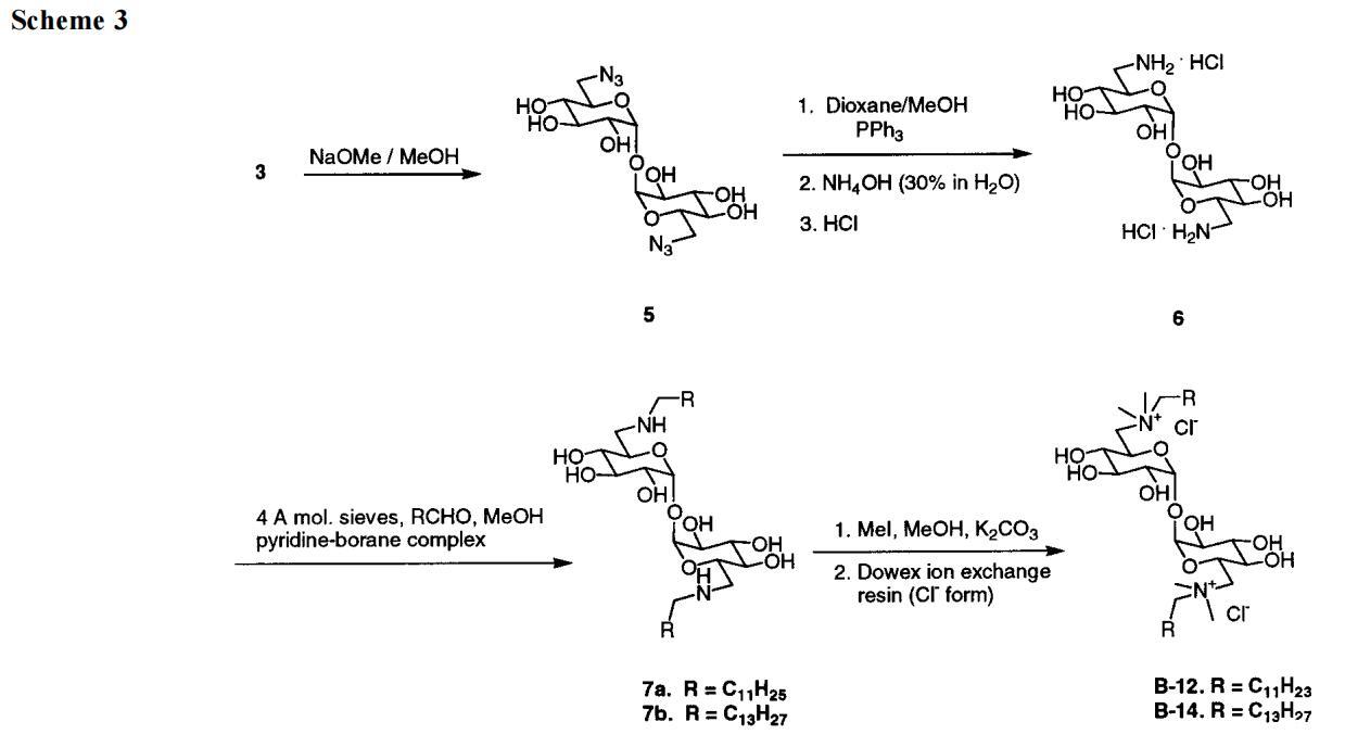接下來,我們提出了在海藻糖衍生物上放置陽離子基團以改善其水溶性的想法。必須承認(rèn),我們對更易管理的水溶性化合物的前景感到一定程度的高興。B系列就這樣出現(xiàn)了。然而,我們立即面臨新的問題。雖然B-12和B-14是作為純化合物獲得的,但B-16和B-18并非如此。后兩種Gemini的產(chǎn)率較低,提供了令人滿意的光譜數(shù)據(jù),但它們的元素分析偏離了理論1-2%(這使我們懷疑存在無機雜質(zhì))。無論如何,由于B-16和B-18不符合我們的高純度標(biāo)準(zhǔn),我們在注意力上輕視了它們,而偏愛它們的矮表親。