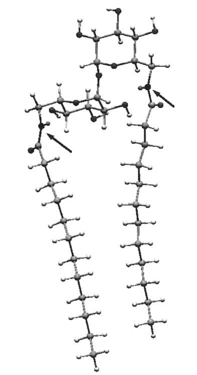 計算首先將海藻糖插入宏模型程序42,并對結(jié)構(gòu)進行琥珀色能量最小化。從使用琥珀色*力場的25000個構(gòu)象搜索中,我們選擇了能量最低的構(gòu)象,該構(gòu)象恰好與報告的X射線結(jié)構(gòu)重疊。43,44接下來,該結(jié)構(gòu)中的6-和6′-羥基被乙酰氨基取代。在模擬的水環(huán)境中,用AMBER*再次進行了25000次構(gòu)象搜索。然后乙酰基被十二烷基取代,然后對生成的a-12雙子座進行了另一次搜索。結(jié)果表明,整個構(gòu)象由酰胺羰基和相鄰葡萄糖環(huán)的2-羥基之間的兩個分子內(nèi)氫鍵控制。氫鍵導(dǎo)致兩條全反式鏈彼此擺動約95°。A-12的固態(tài)紅外光譜證實了這種相互作用,該光譜顯示1646 cm-1處有羰基帶,而Hecameg的羰基帶為1700 cm-1,單體葡萄糖類似物的羰基帶為1698 cm-1。25由于這種構(gòu)象會不切實際地排除分子內(nèi)疏水締合,而且在任何情況下,羰基氫鍵位點的溶劑可能會淹沒在水中,我們故意不允許-CdO氫鍵,并重新計算。通過這種方式,我們得到了圖6。可以看到,一條鏈上大約有八個碳與其伙伴鏈的碳并排排列。N/N距離僅為7.4?,整體分子形狀為“管狀”。用另一種方式說,糖的頭基延伸的距離不比兩條鏈的寬度大多少,就像人們預(yù)期的一種易于堆積成雙層的化合物那樣。45因此,正如前面從實驗數(shù)據(jù)得出的結(jié)論,海藻糖更像是一個統(tǒng)一的頭基,而不是一個可以有效隔離鏈的長間隔基。
