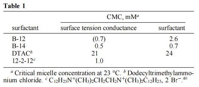 B-12和B-14確實是水溶性化合物,在臨界膠束濃度(CMC)以上形成膠束,動態(tài)光散射顯示顆粒大小小于5nm。CMC值是通過表面張力-濃度曲線(圖4)和電導(dǎo)率-濃度曲線(圖5)中的斷裂來確定的。38表1給出了結(jié)果數(shù)據(jù)(以及兩種常規(guī)表面活性劑的數(shù)據(jù),用于比較)。如圖所示,B-12的CMC值通過張力測量法和電導(dǎo)測量法(這兩種方法都是可重復(fù)的)得出的結(jié)果不一致。這種差異至少部分可以追溯到B-12表面張力的時間依賴性。因此,在10分鐘的過程中,B-12水溶液的表面壓力增加了10 mN/m,之后趨于穩(wěn)定。這種動態(tài)表面張力過程(之前已經(jīng)用雙子座表面活性劑觀察到)13,15,39可能與雙子座表面活性劑在空氣/水界面組織方面的困難有關(guān)。為了解決這個問題,圖4中的B-12溶液在表面張力測量之前老化20分鐘,從而減少了系統(tǒng)尚未平衡的可能性。盡管采取了這種預(yù)防措施,但我們無法確定依賴時間的界面重組是否不會影響B(tài)-12圖,并導(dǎo)致基于張量和電導(dǎo)的數(shù)據(jù)之間的差異。當(dāng)然,后者來源于不受界面事件影響的大塊特性,因此更可靠。有趣的是,B-14沒有表現(xiàn)出隨時間變化的表面張力,兩種方法確定的CMC值是合理一致的。也許更長的鏈既增強了對空氣/水界面的親和力,也增強了從溶液中吸收界面的動力學(xué)。