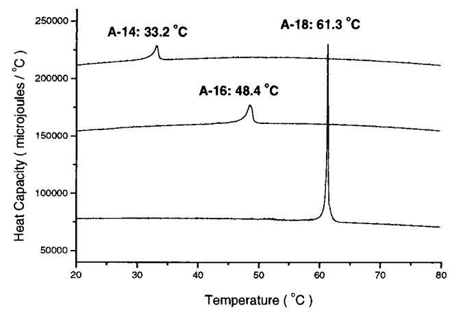 圖3。通過差示掃描量熱法(DSC)在10°C/h的加熱速率下獲得的雙子座A-14、A-16和A-18的2 mg/mL懸浮液的吸熱峰。