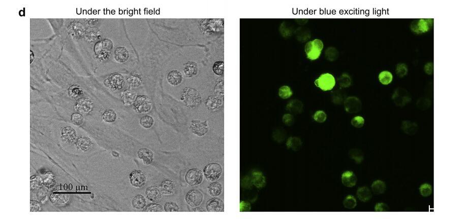然后,我們進一步評估了基于體外共培養(yǎng)系統(tǒng)的細胞選擇性,該系統(tǒng)包含HL60癌細胞和HDFa原代細胞,它們與體內(nèi)環(huán)境非常相似[8]。將最終濃度為20 mM的FITC-G(IIKK)3I-NH2添加到系統(tǒng)中,培養(yǎng)1 h后,用熒光顯微鏡觀察兩種細胞中的肽分布(圖1d)。很明顯,綠色熒光集中在懸浮和圓形HL60細胞中,而不是粘附和紡錘形HDFa細胞中,這再次表明肽具有良好的細胞選擇性,以及對癌細胞的快速識別。