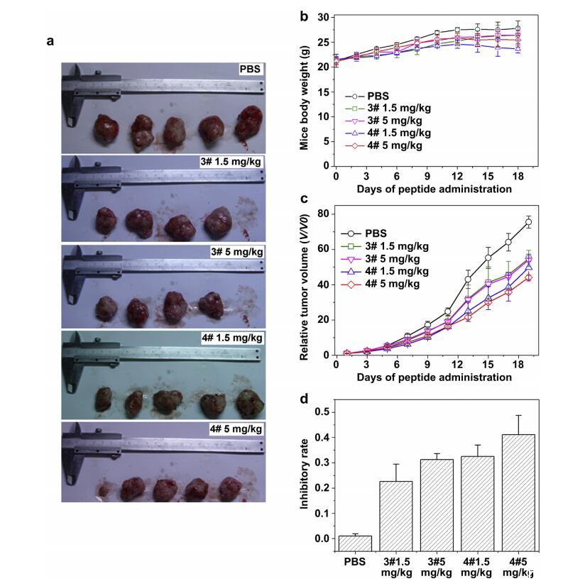 將人宮頸癌HeLa細胞接種于裸鼠皮下。腫瘤植入5天后,分別以1.5 mg/kg和5 mg/kg的劑量腹腔注射肽G(IIKK)3INH2和G(IIKK)4I-NH2。在給藥期間,未觀察到任何毒性跡象,如體重減輕和外觀不良(圖6b),盡管G(IIKK)4I-NH2顯示出更高的體外溶血性。與PBS中的陰性對照相比,這兩種肽對腫瘤生長表現(xiàn)出明顯的抑制作用,其中G(IIKK)4I-NH2表現(xiàn)出比G(IIKK)3I-NH2更好的療效(圖6c),這與它們的體外抗腫瘤趨勢一致。18天后,解剖腫瘤并稱重(圖6a和d)。在1.5 mg/kg和5 mg/kg劑量下,G(IIKK)3I-NH2治療組的腫瘤生長抑制率分別為0.23和0.31。G(IIKK)4I-NH2能產(chǎn)生更有效的抑制作用,在1.5 mg/kg和5 mg/kg劑量下,抑制率分別為0.32和0.41。這些數(shù)據(jù)表明,在小鼠異種移植模型中,螺旋肽可以有效地抑制腫瘤生長,而腫瘤細胞不能被完全清除。許多抗腫瘤藥物的不完全抑制作用已被廣泛觀察到,這可歸因于多種機制,例如藥物從腫瘤部位相對較快地清除,以及它們難以通過壞死區(qū)域擴散[42],但目前這組肽背后的確切原因有待進一步的機理研究。