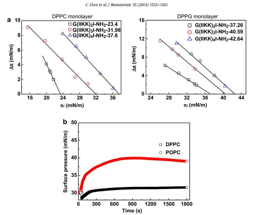 圖2。肽與不同脂質(zhì)單層的相互作用。(a)當肽以3 mM濃度注入亞相時,在不同初始表面壓力(pi)下,DPPC和DPPG單分子膜的表面壓力增加(Dp)。(b)將G(IIKK)3I-NH2注入DPPC和POPC單分子膜的亞相后的表面壓力與時間的關(guān)系。