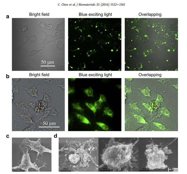 圖3。肽的原位定位和質(zhì)膜完整性。(a)用10mM FITC-G(IIKK)3I-NH2孵育1h后HeLa細胞中的肽位置。(b)用10mM FITC-G(IIKK)3I-NH2孵育24h后HeLa細胞中的肽位置。(c)未經(jīng)處理的HeLa細胞的代表性SEM顯微照片。(d)用10mM G(IIKK)3I-NH2處理24小時的HeLa細胞的代表性SEM顯微照片。