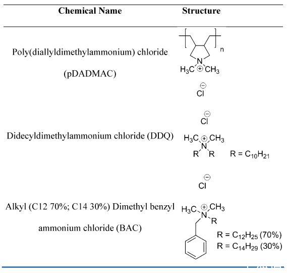 試劑和樣品制備。pDADMAC,Mv=8.5 kDa,作為28 wt%的水溶液從Poly Sciences Inc.獲得,pDADMAC,Mv=21和140 kDa,分別作為35和20 wt%的溶液從Sigmaldrich獲得。DDQ從Lonza(商品名-Lonza Bardac 2240)獲得,并以40 wt%的水溶液形式收到。BAC從Thor(商品名-Activide BAC 50 M)獲得,并以50 wt%的水溶液形式接收。通過在80°C的真空烘箱中干燥,通過重量法驗證上述儲備溶液的濃度,直到未記錄進一步的質量損失。每個樣品進行三次重復測量,并記錄平均結果。除非另有說明,否則表面活性劑和聚電解質均按原樣使用,無需進一步純化(表1)。