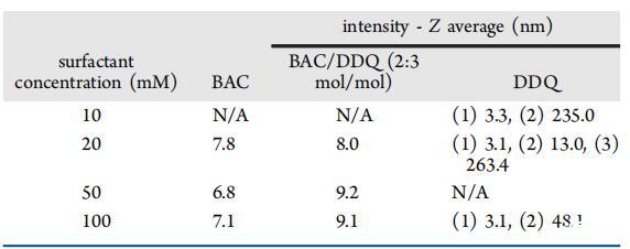 光子相關(guān)光譜(PCS)用于測(cè)定膠束的流體動(dòng)力學(xué)直徑。BAC和BAQ/DDQ 2:3 mol/mol的PCS分布圖(圖1b)顯示了在相關(guān)濃度范圍內(nèi)的單峰分布,平均Z平均值和單峰分布表明存在橢球或球形膠束幾何結(jié)構(gòu)。DDQ呈現(xiàn)雙峰/三峰分布,表明膠束結(jié)構(gòu)具有較大的聚集數(shù)(表4)。這可以用具有徑向長(zhǎng)度和軸向長(zhǎng)度的圓柱形幾何體或與單分子或多分子囊泡平衡的球形膠束來(lái)解釋。28這兩種情況與早期DDQ熒光探針研究的結(jié)果一致,該研究觀察到膠束聚集數(shù)從20增加到86,濃度從10增加到81 mM。29